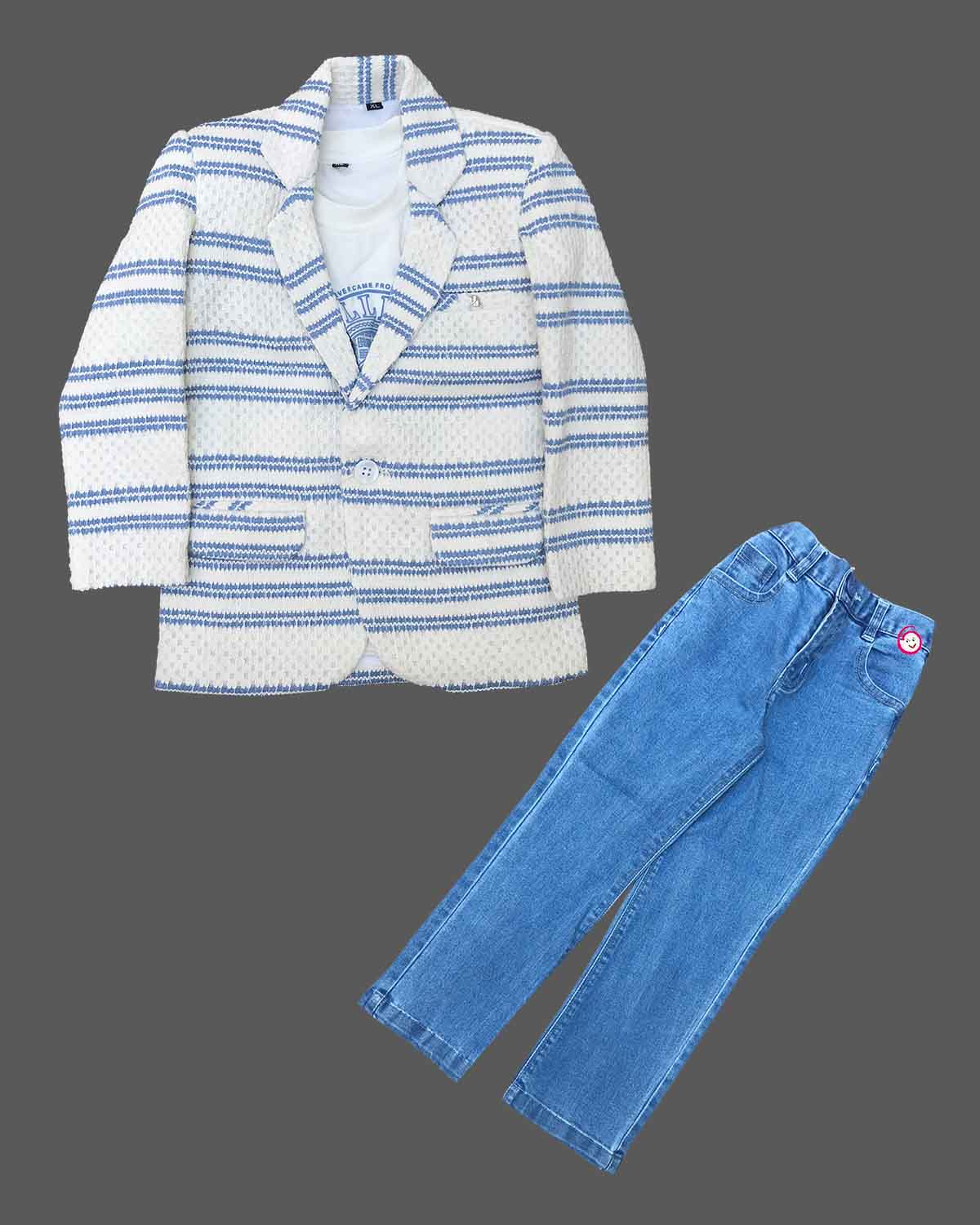 Boys striped blazer & design print t shirt with pant