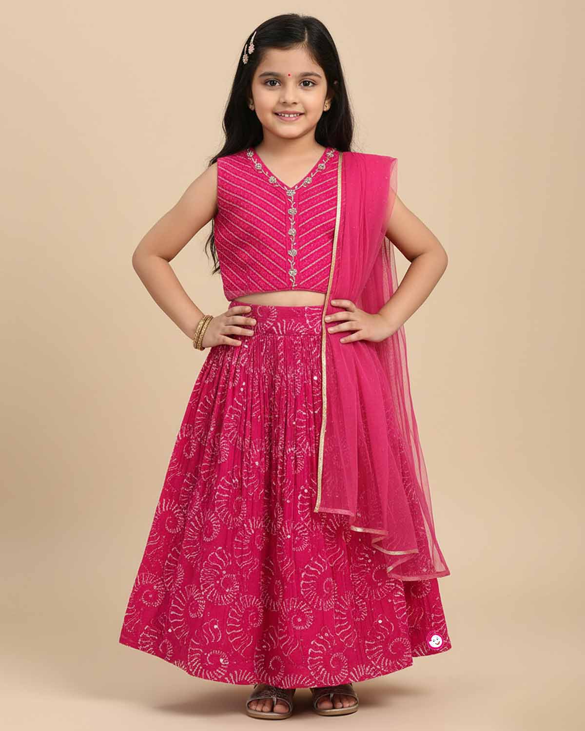 Girls round neck with top with printed skirt choli set - Dark Pink