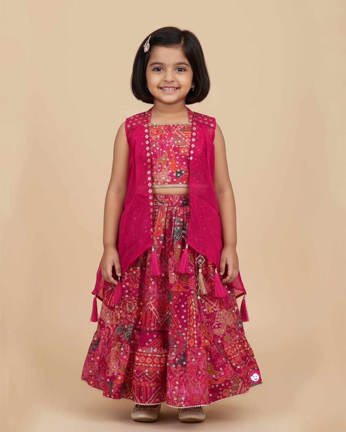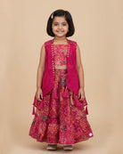 Girls Embroidered Crop Top With Oval Coat And Skirt - Dark Pink