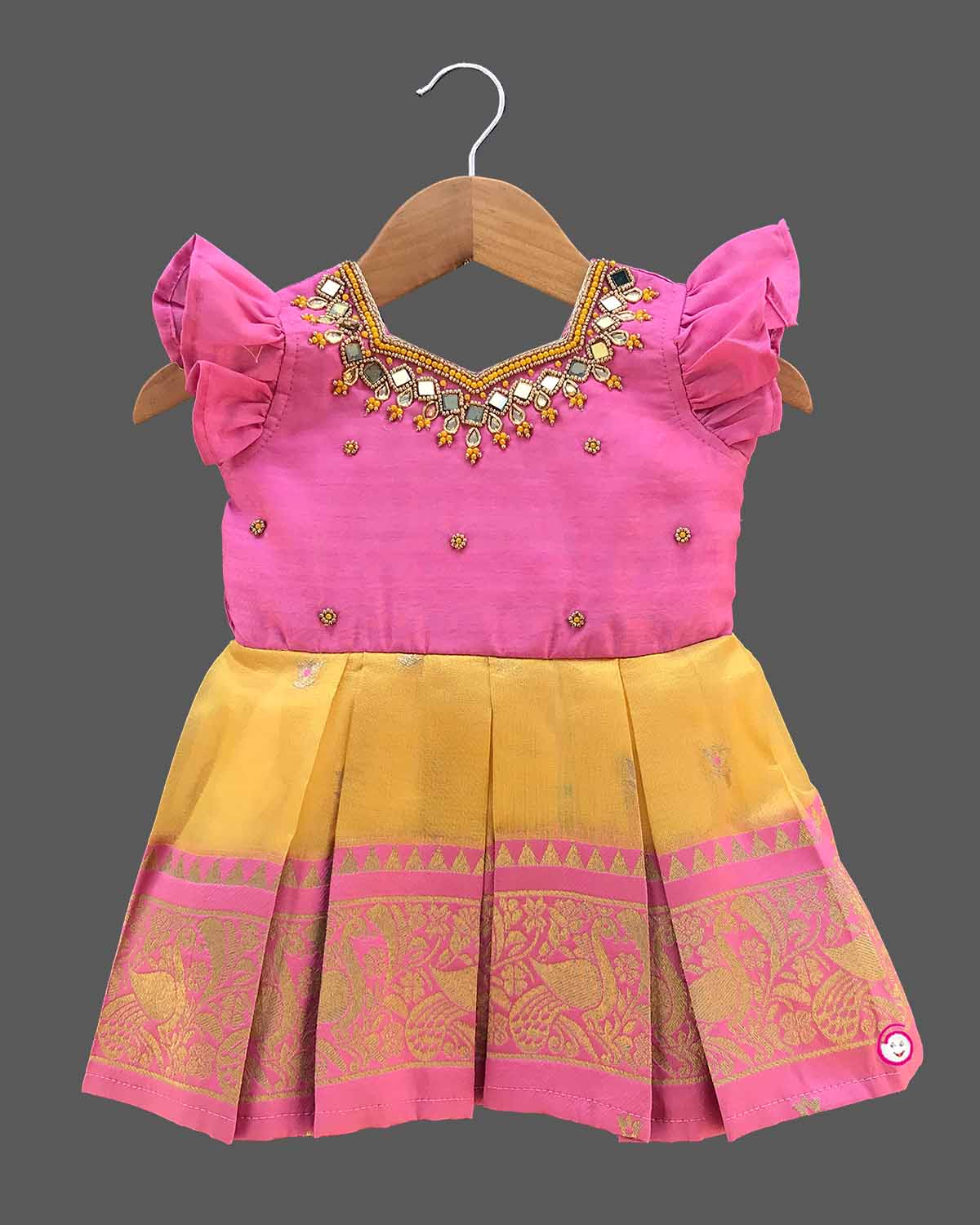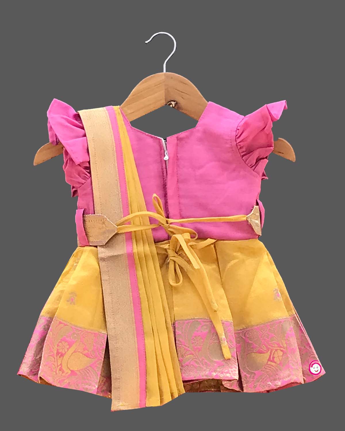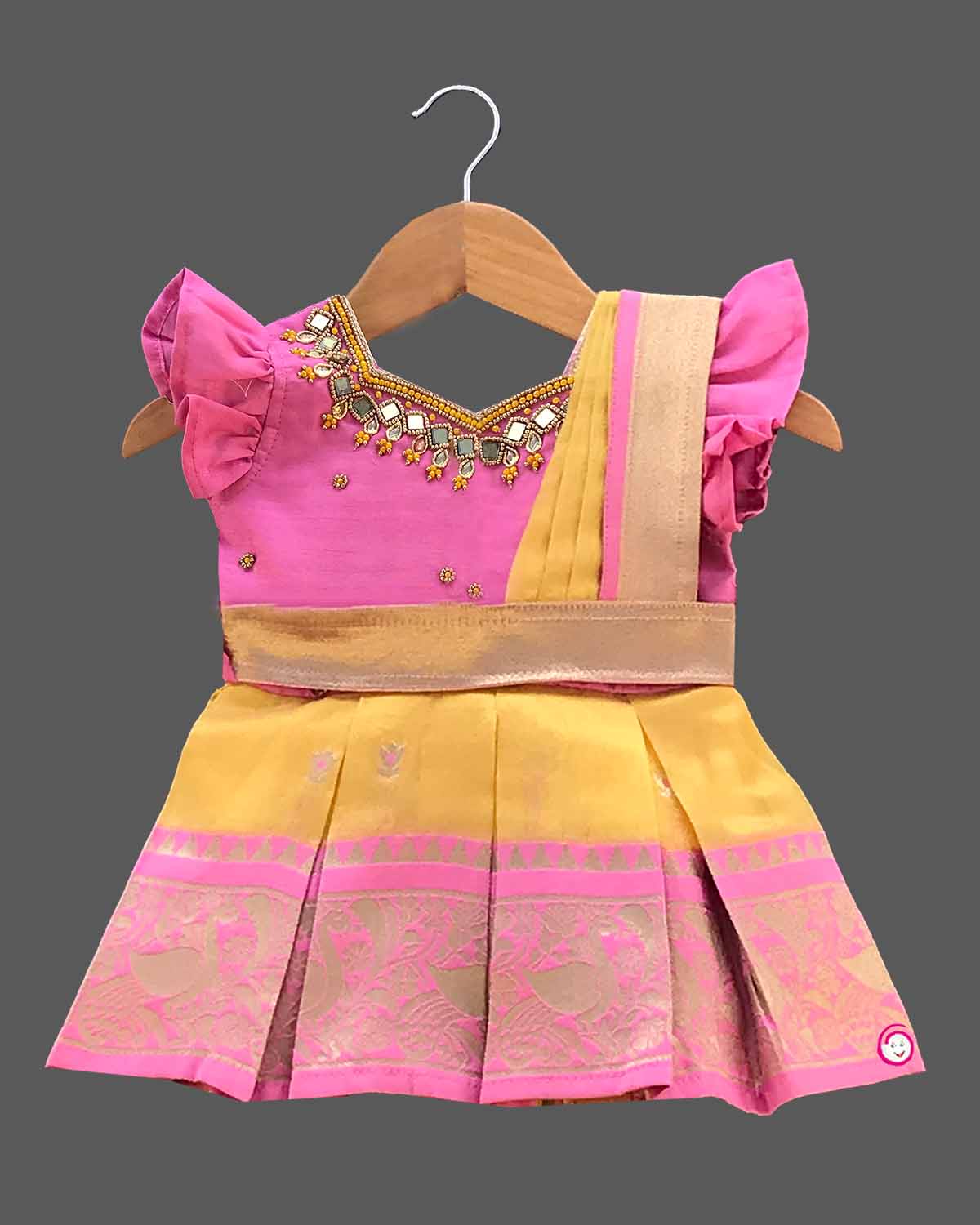 Girls traditional saree pleated embroidered traditional frock - Pink
