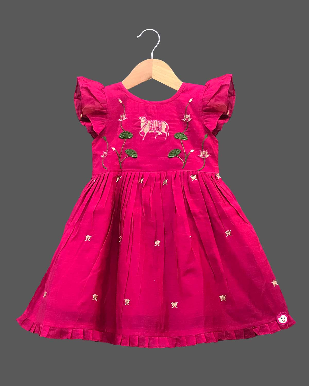Girls floral and leaf printed traditional frock - Dark Pink