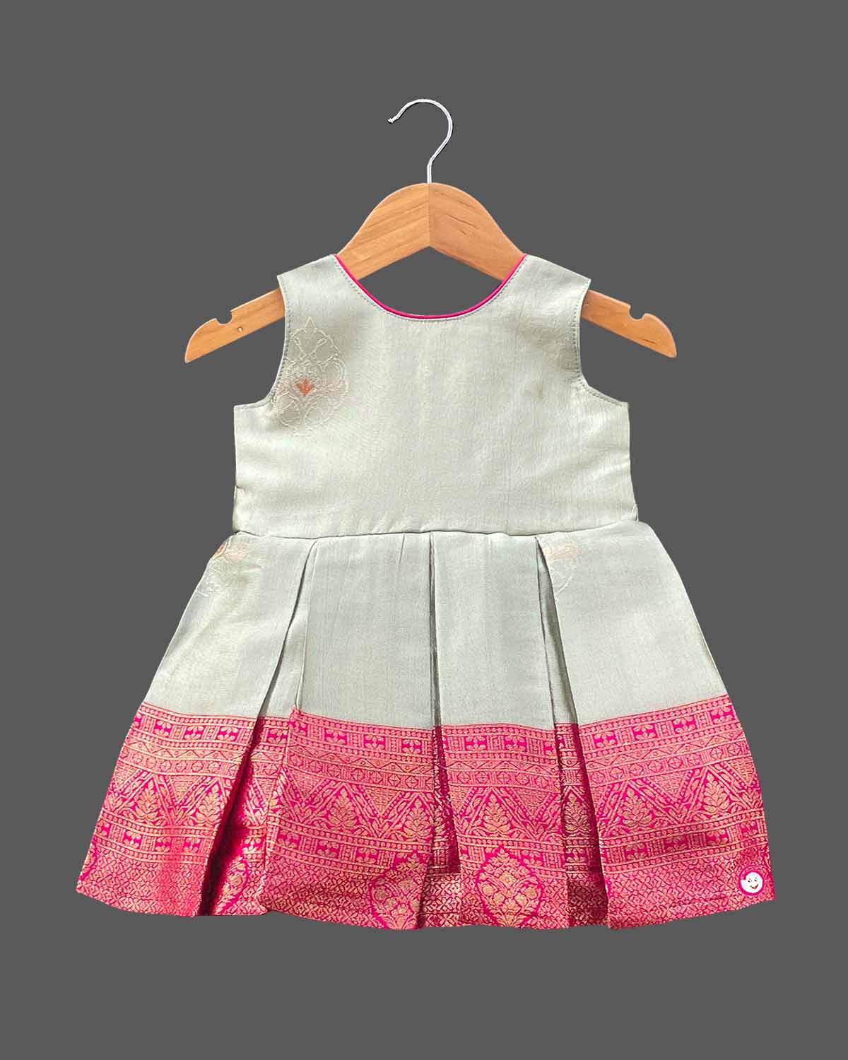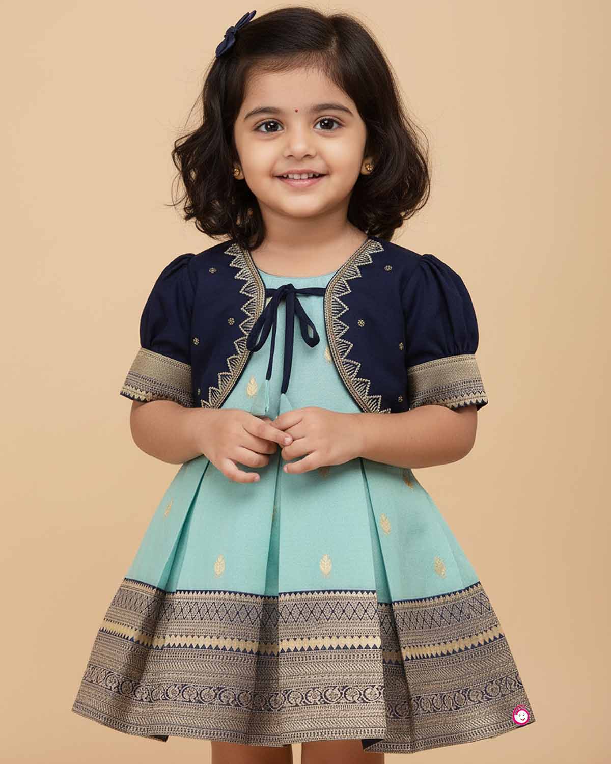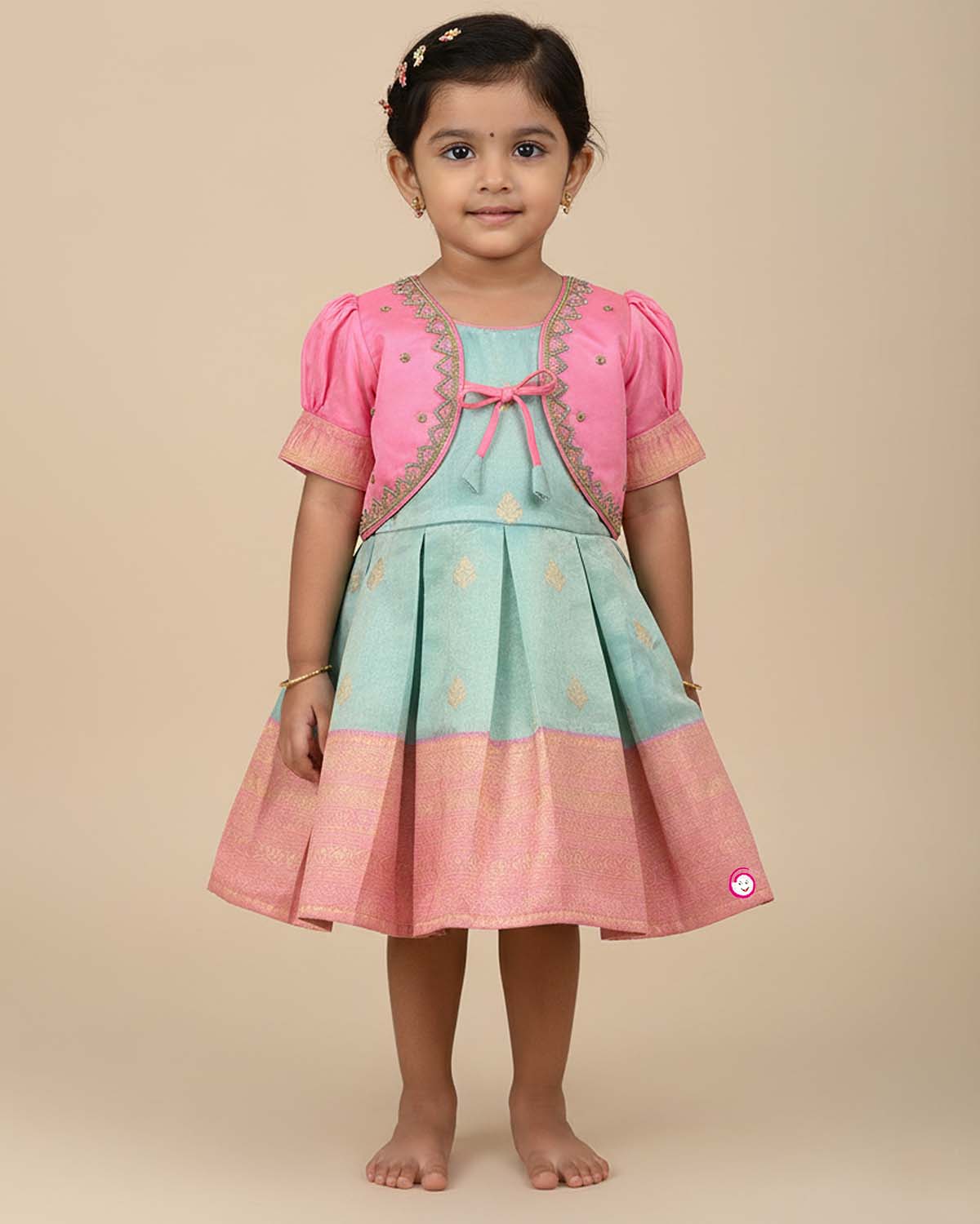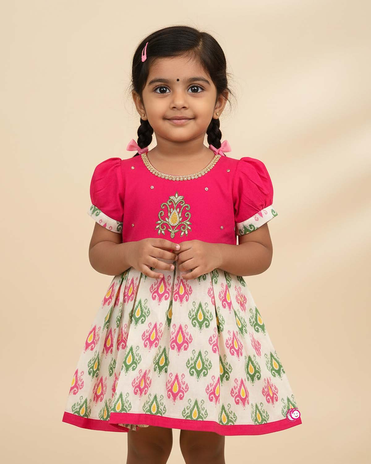 One of the most popular choices in girls ethnic wear is the Traditional Pattu frock. This is a fusion of Indian Elegance and a western frock. Made from luxurious Silk cotton fabric, these frocks are known for their rich texture and vibrant colors. They come in various designs, including floral motifs, peacock patterns, and geometric prints, making them a favorite among parents and children alike. The charm of kids traditional pattu frocks lies in their traditional yet trendy appeal, making them a perfect choice for special occasions.