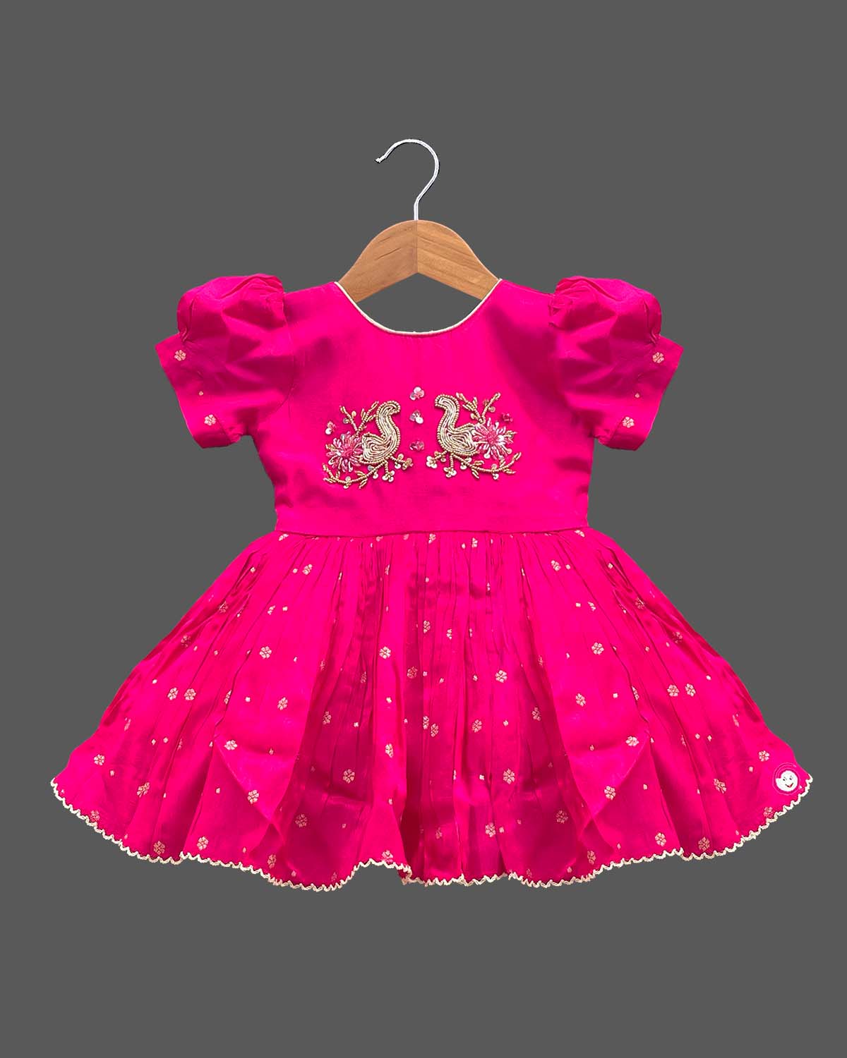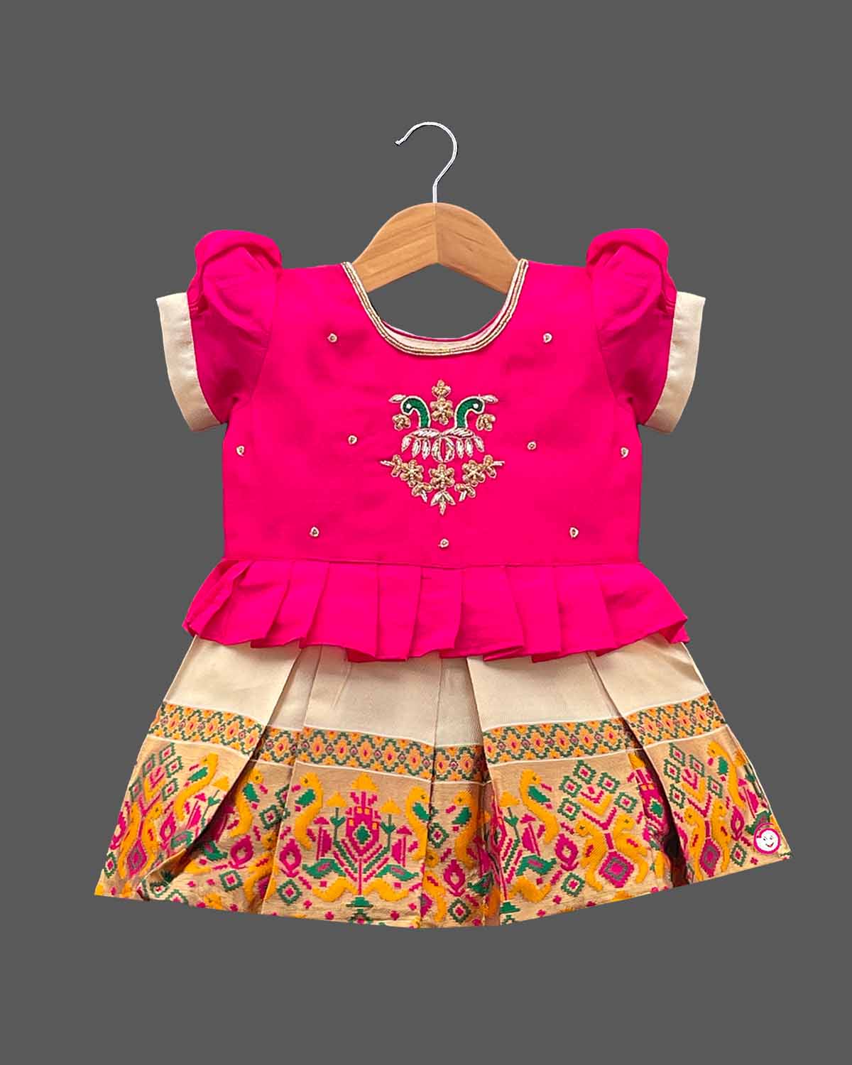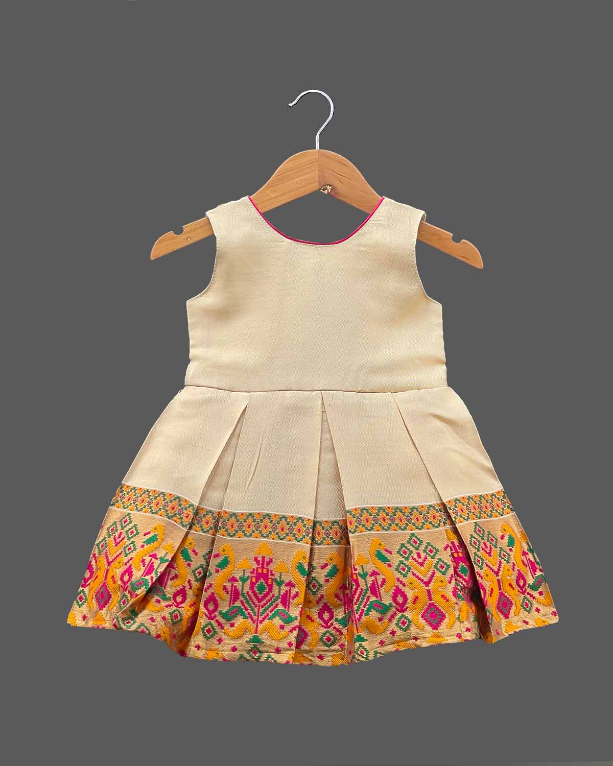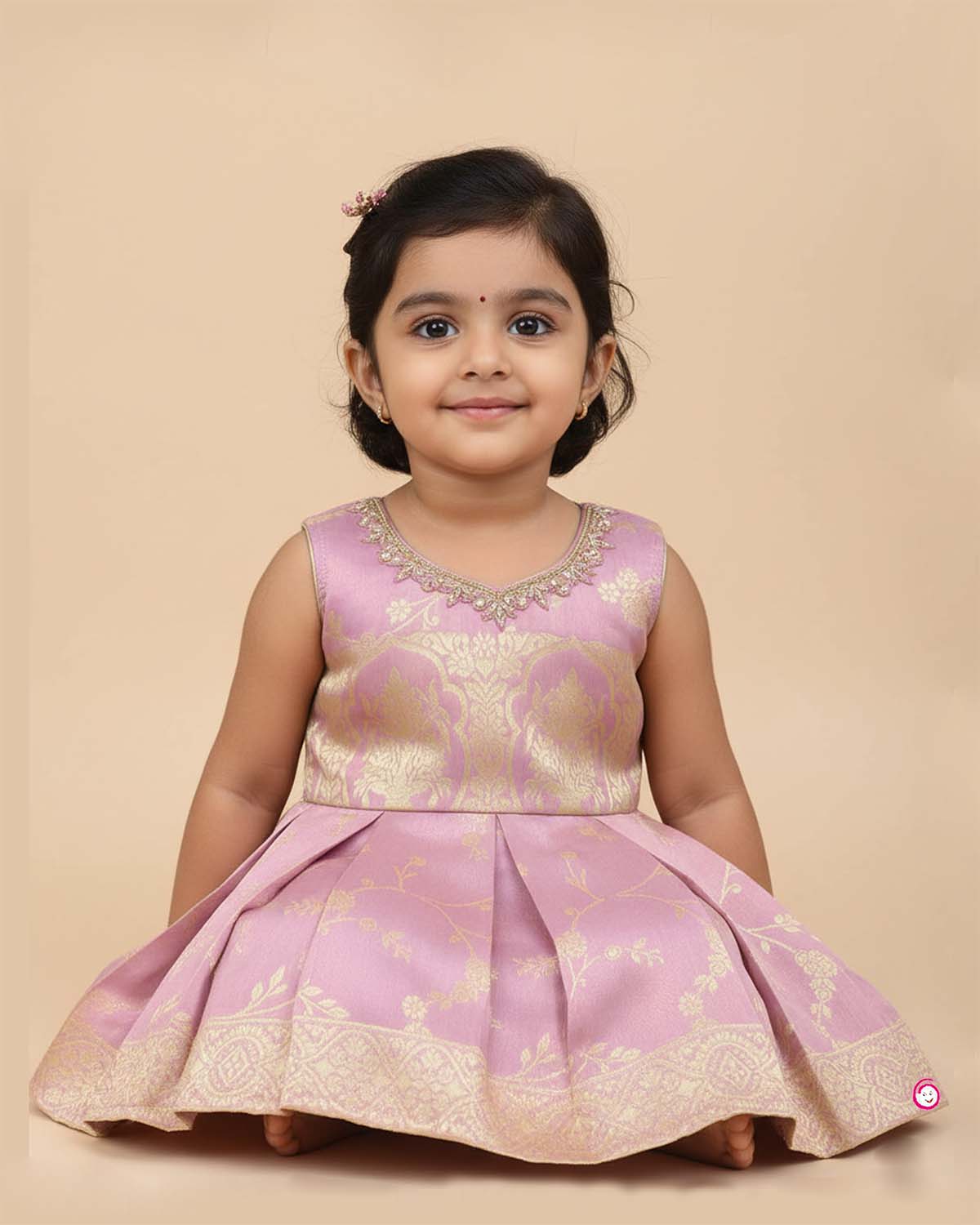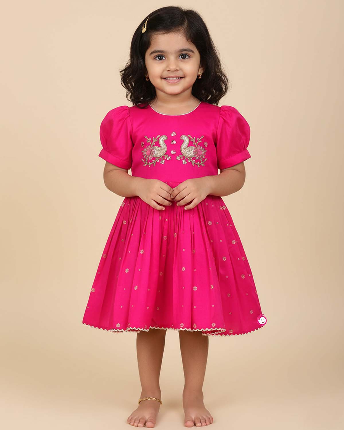One of the most popular choices in girls ethnic wear is the Traditional Pattu frock. This is a fusion of Indian Elegance and a western frock. Made from luxurious Silk cotton fabric, these frocks are known for their rich texture and vibrant colors. They come in various designs, including floral motifs, peacock patterns, and geometric prints, making them a favorite among parents and children alike. The charm of kids traditional pattu frocks lies in their traditional yet trendy appeal, making them a perfect choice for special occasions.