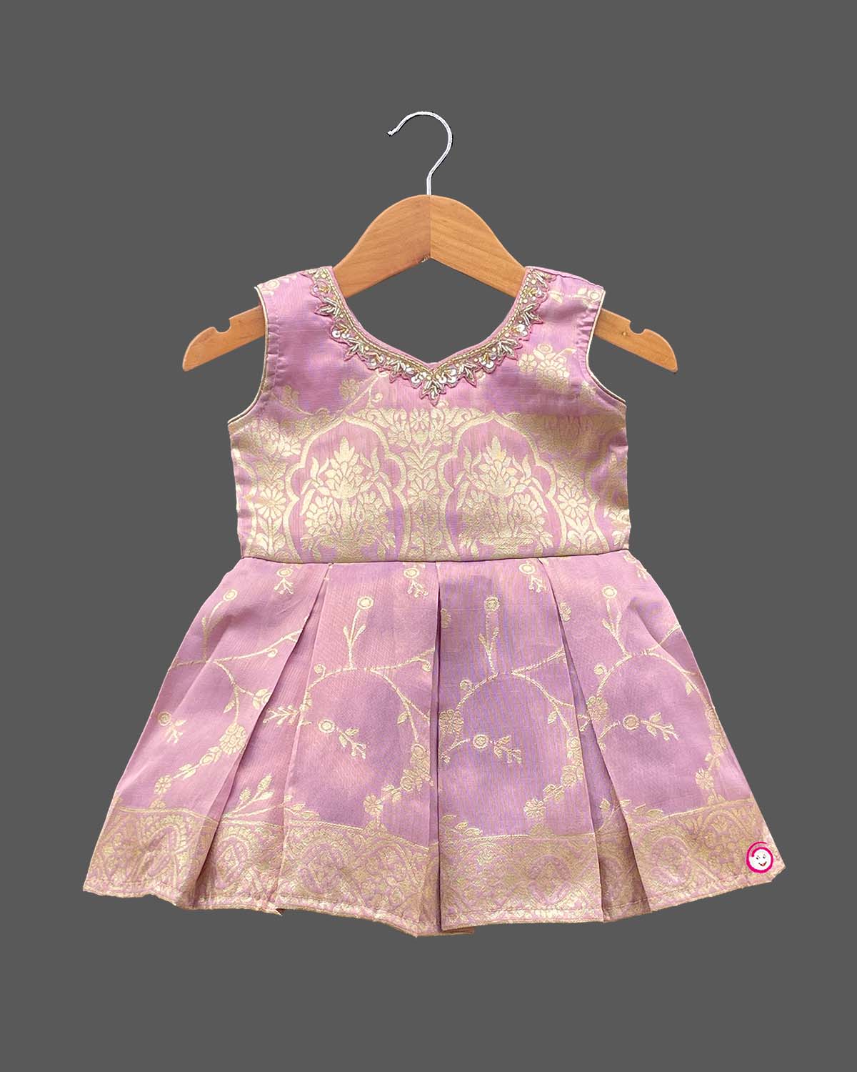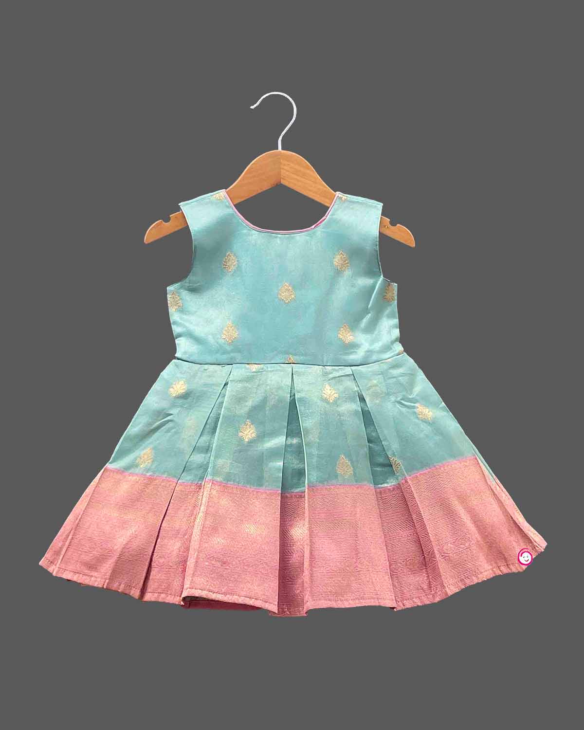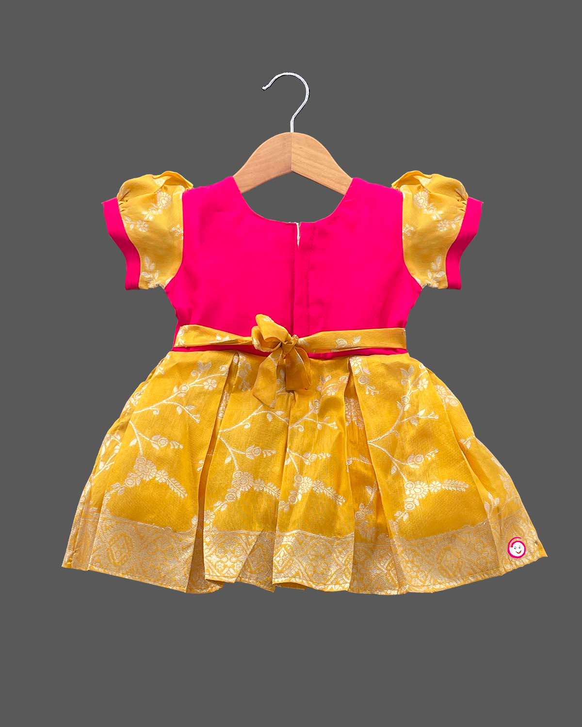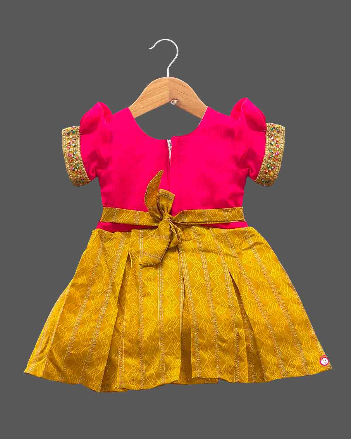 One of the most popular choices in girls ethnic wear is the Traditional Pattu frock. This is a fusion of Indian Elegance and a western frock. Made from luxurious Silk cotton fabric, these frocks are known for their rich texture and vibrant colors. They come in various designs, including floral motifs, peacock patterns, and geometric prints, making them a favorite among parents and children alike. The charm of kids traditional pattu frocks lies in their traditional yet trendy appeal, making them a perfect choice for special occasions.