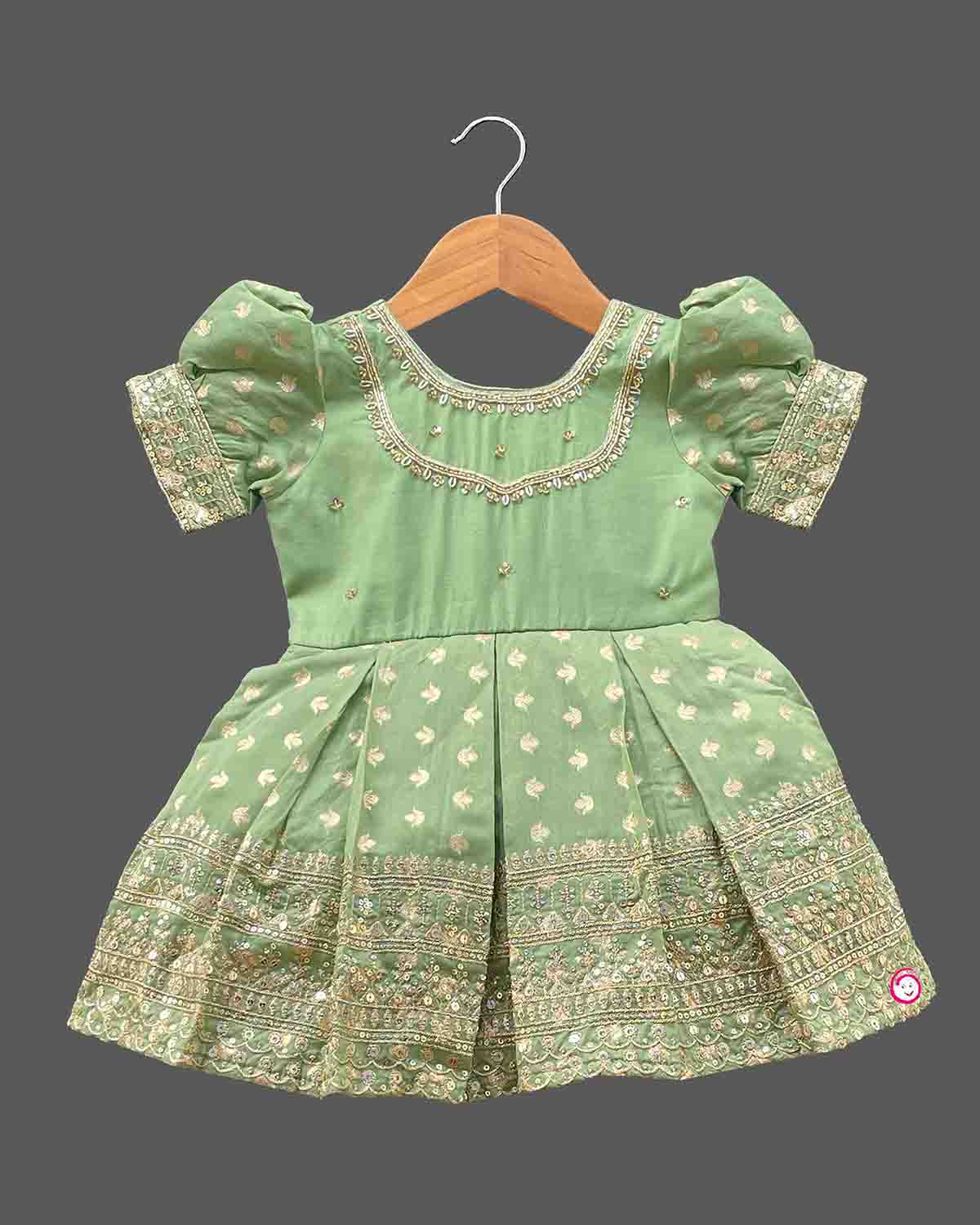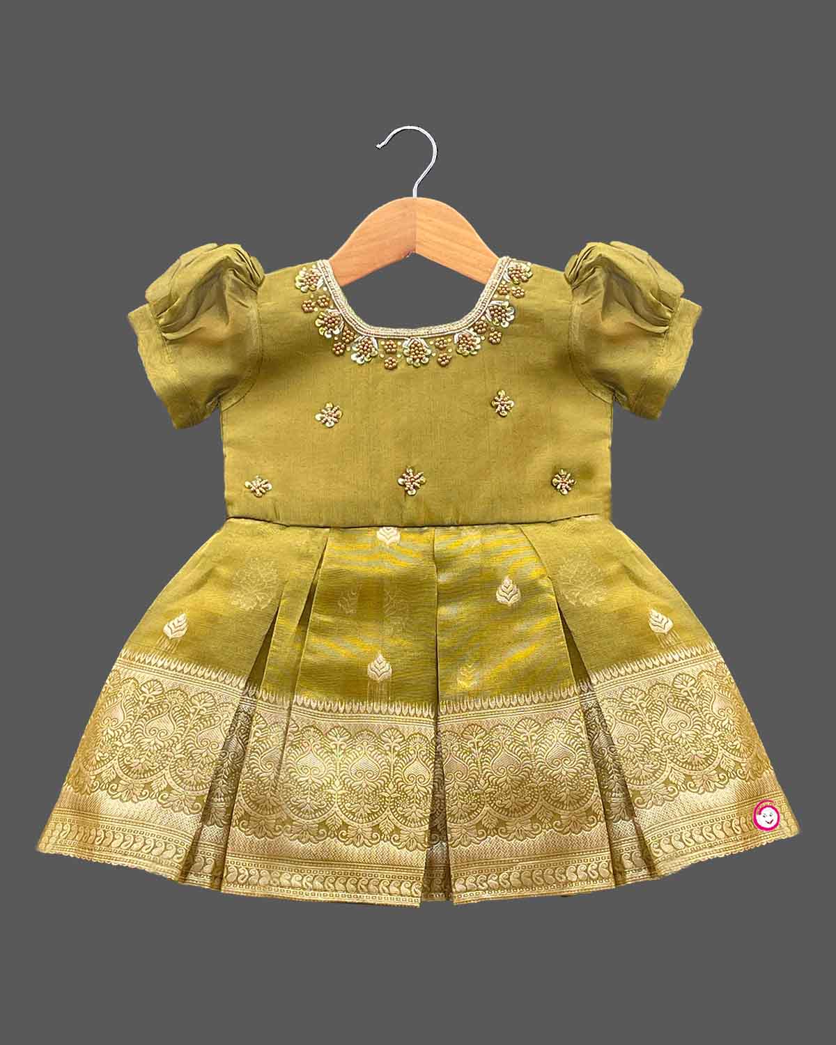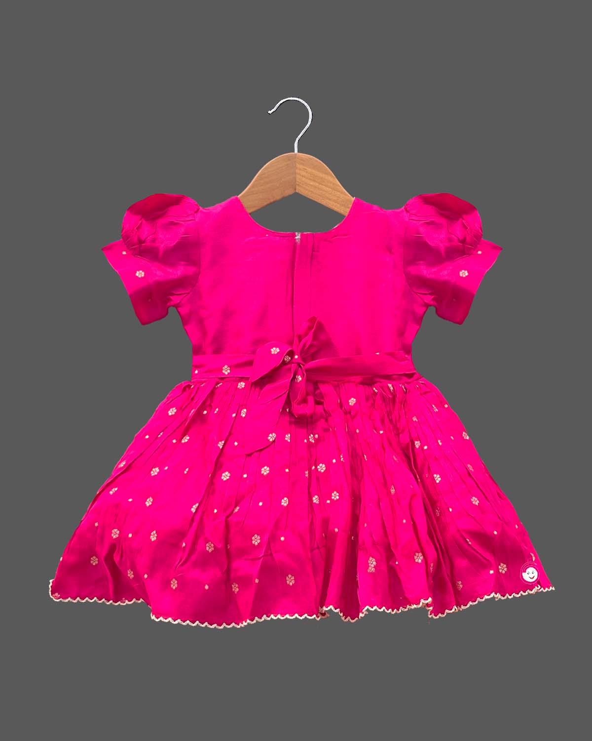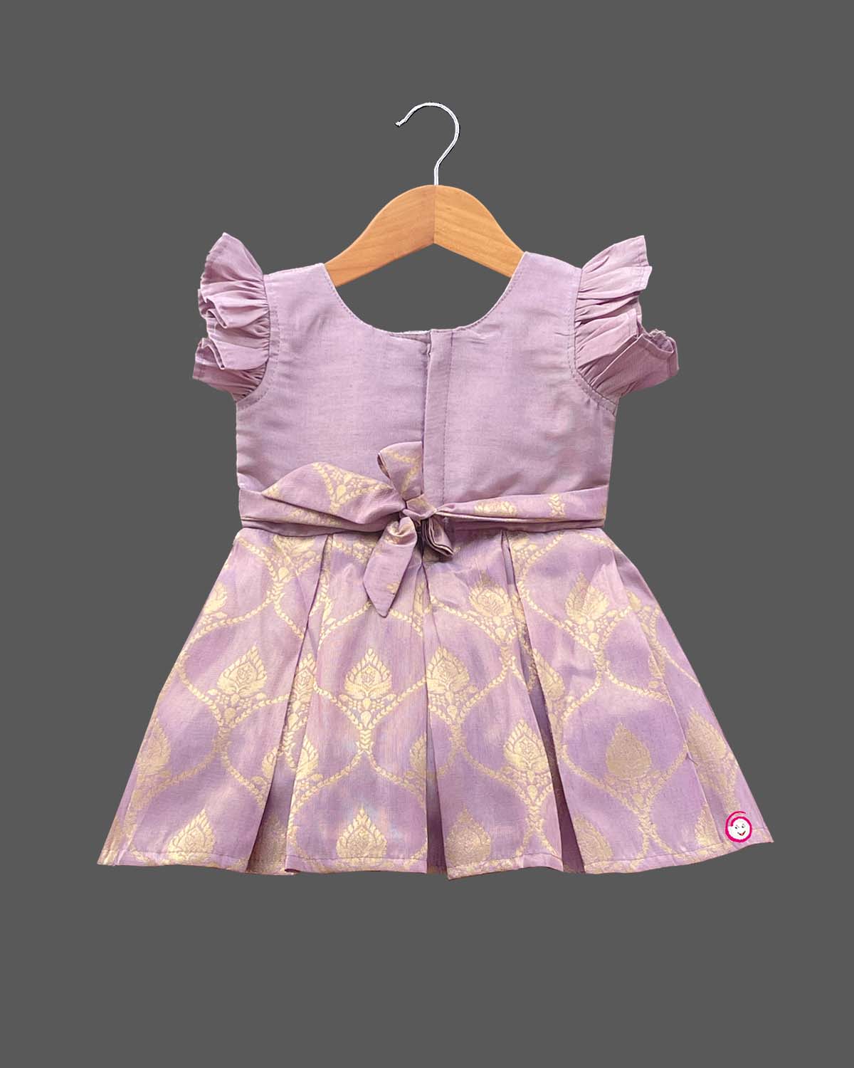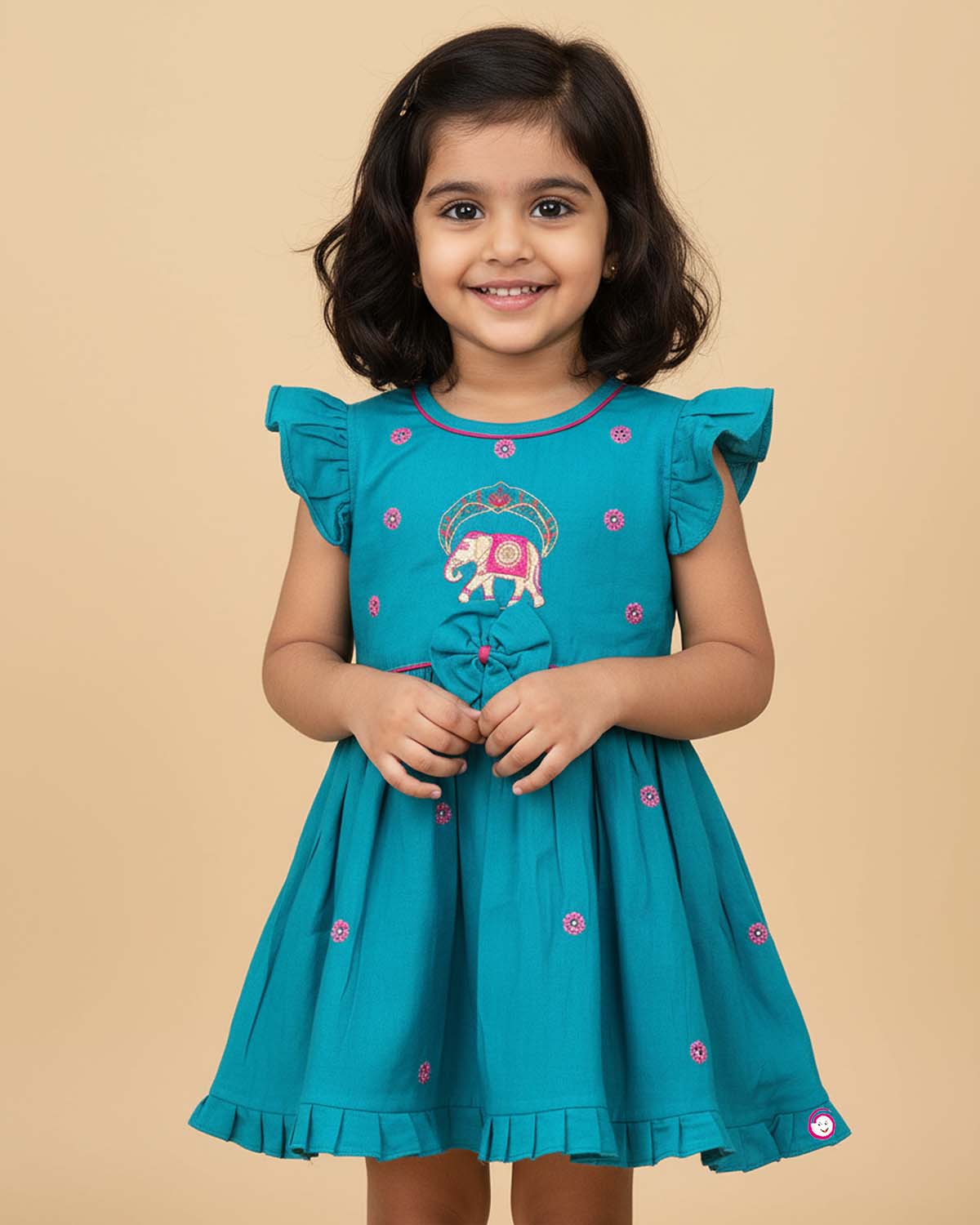 One of the most popular choices in girls ethnic wear is the Traditional Pattu frock. This is a fusion of Indian Elegance and a western frock. Made from luxurious Silk cotton fabric, these frocks are known for their rich texture and vibrant colors. They come in various designs, including floral motifs, peacock patterns, and geometric prints, making them a favorite among parents and children alike. The charm of kids traditional pattu frocks lies in their traditional yet trendy appeal, making them a perfect choice for special occasions.