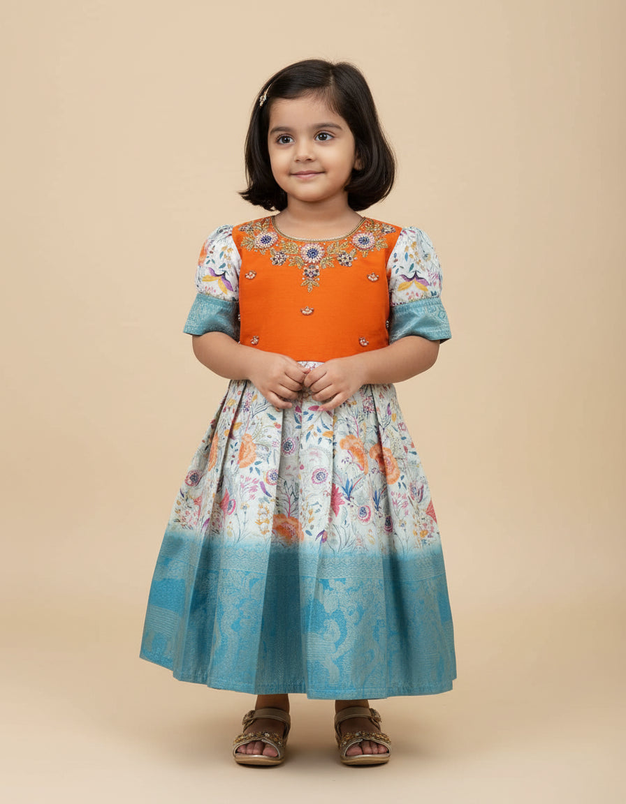 Girls aari designed traditional frock with puff sleeve - Orange