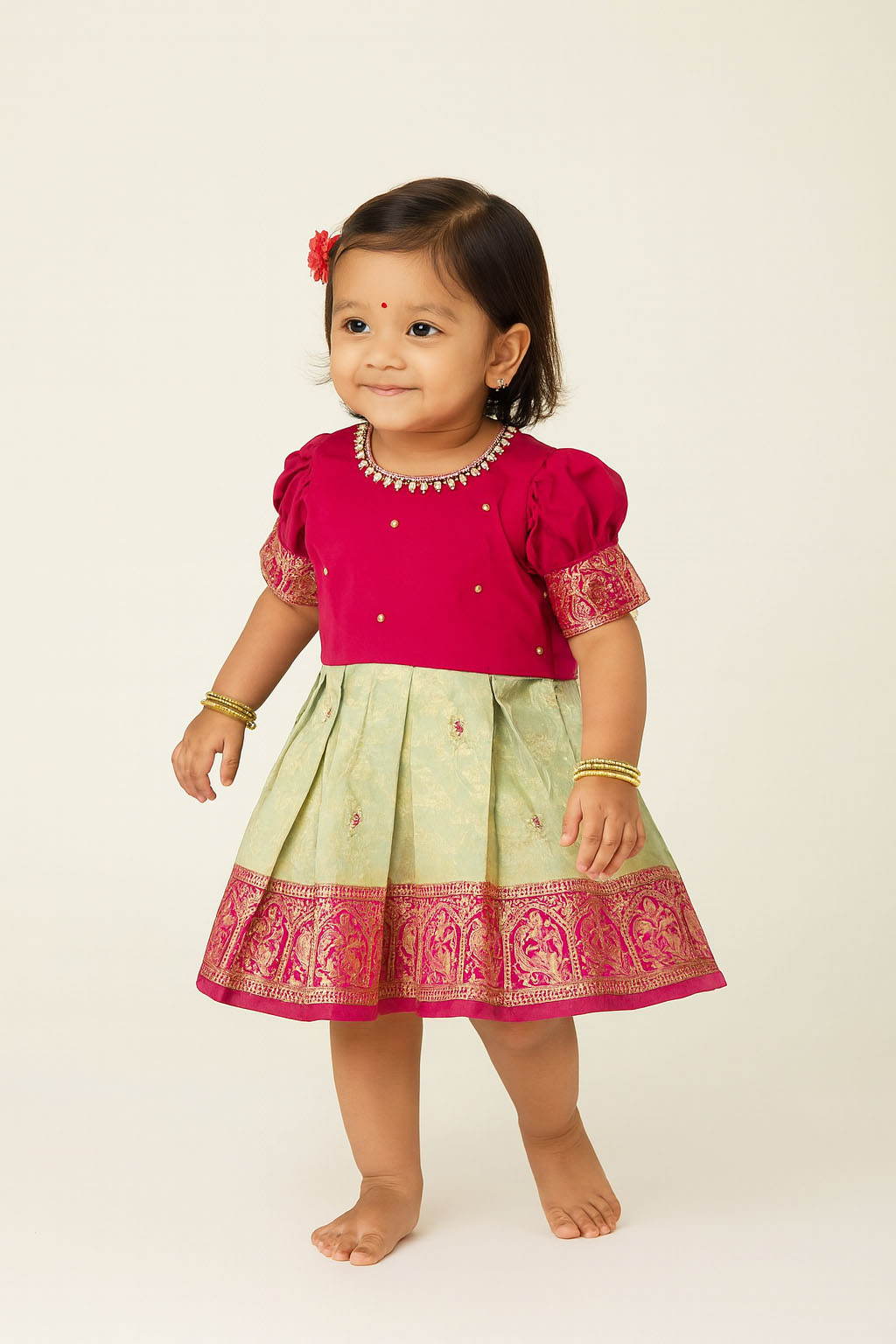 Girls aari with applique frock with puff sleeve - Dark Pink